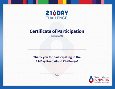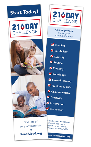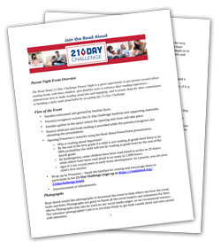 The Read Aloud 21-Day Challenge Parent Night is a great opportunity to get parents excited about reading books with their children; give families tools to enhance their reading experience; demonstrate how to make reading aloud fun and engaging; and to praise them for their commitment to building a daily read aloud habit by accepting the 21-Day Challenge. |