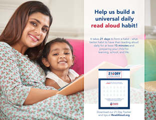 | Spread the word! Celebrate and share your read aloud moments using hashtag #21DayReadAloud and be sure to tag us @Read Aloud for Facebook; @ReadAloud_org for X; and @read_aloud_15 for Instagram. Also, don’t forget to tag friends, family, colleagues, or neighbors so they can join too! |