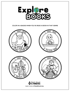 Four badges for children to color as they finish reading a sci-fi, mystery, fantasy, and adventure book.